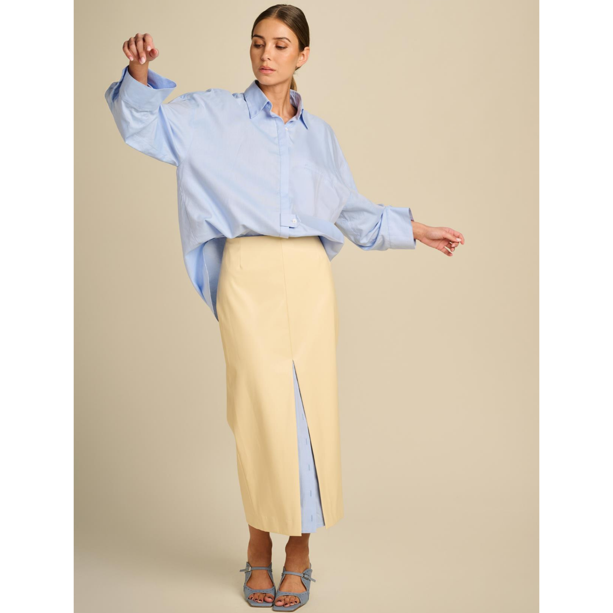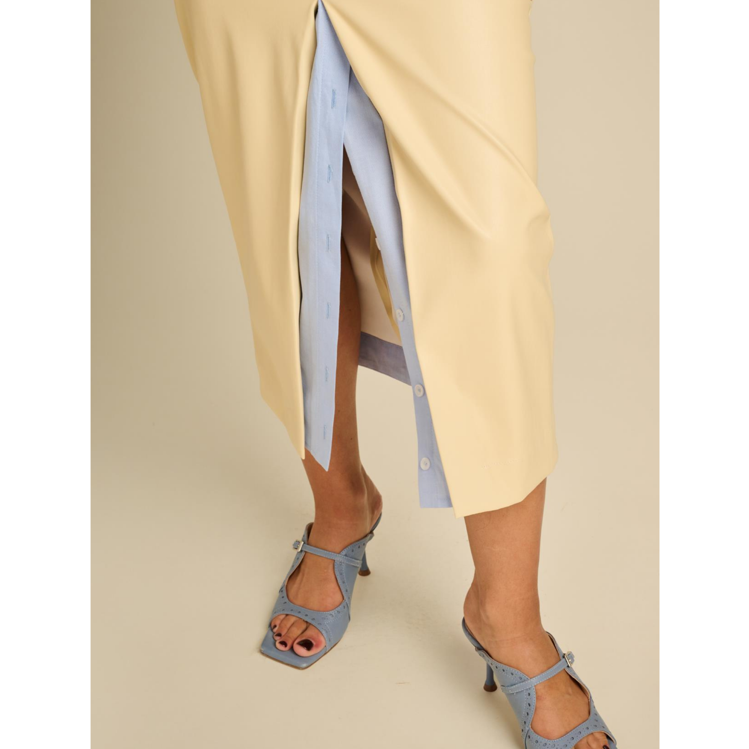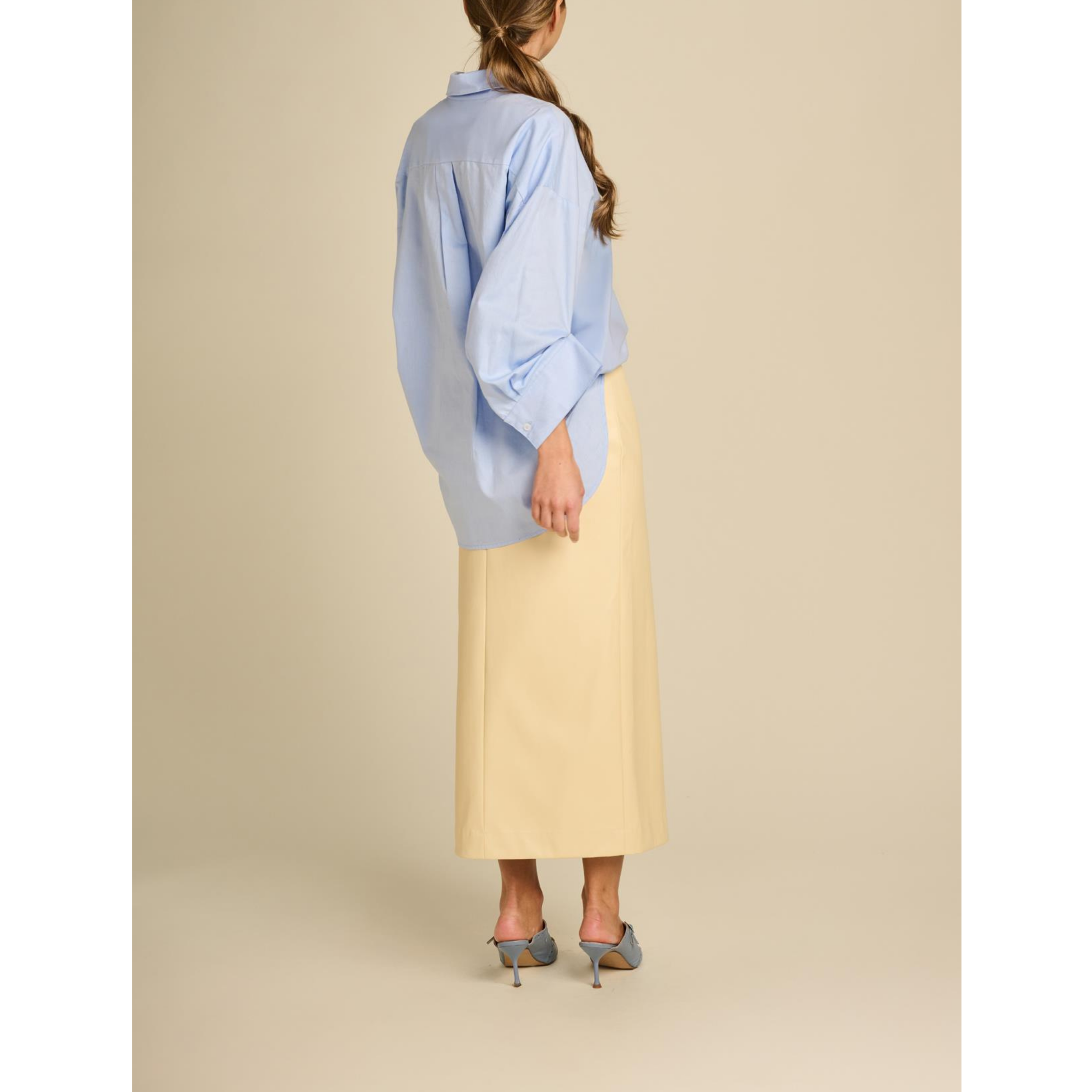 Lange rok, in een gele kleur gemaakt van 52%Polyester en 48%Polyurethaan. De rok valt tot aan de enkel en heeft een split in het midden. Opvallend aan de rok is de blauwe afwerking aan de binnenkant van de split. Dit blauwe blouse materiaal met witte knopen geeft de rok een unieke look.