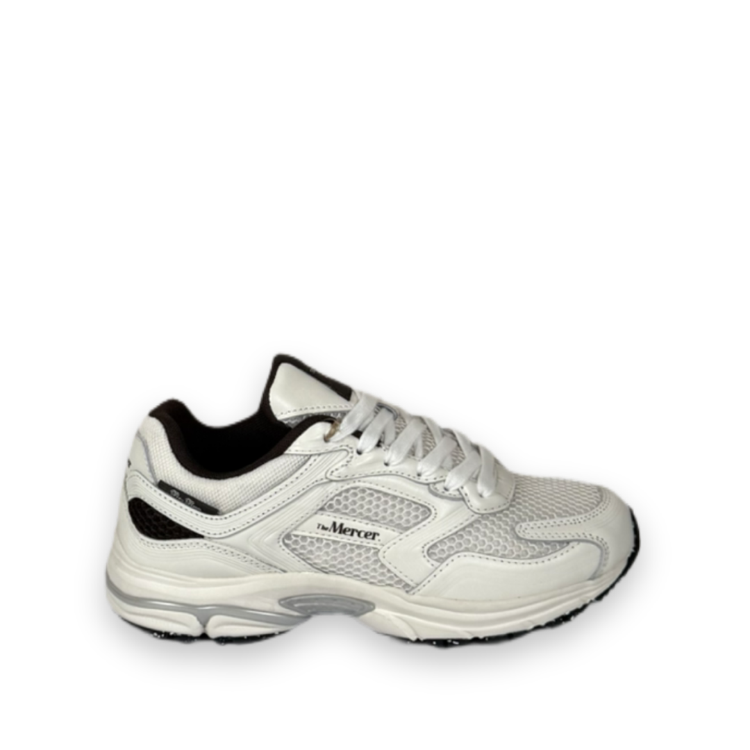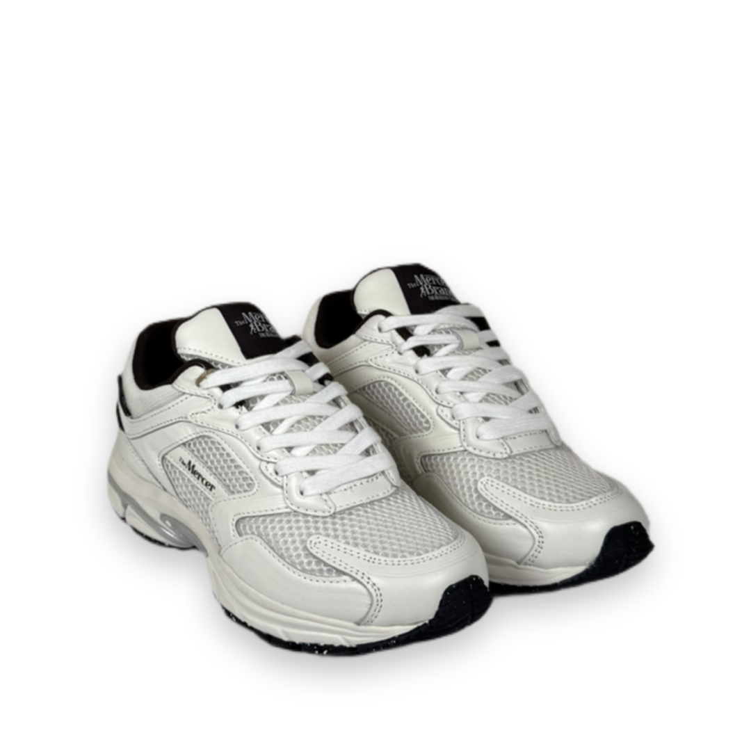 Dit is het eerste model van de najaarscollectie van Mercer. Het model is uitgevoerd in wit leer en wit mesh en afgewerkt met donkerbruine details. Het voetbed is uitneembaar.