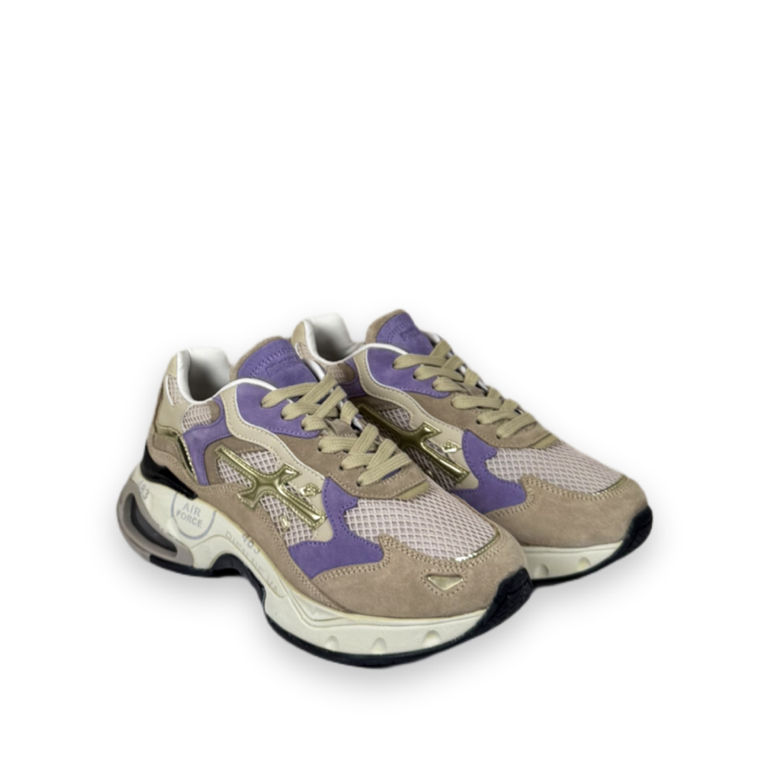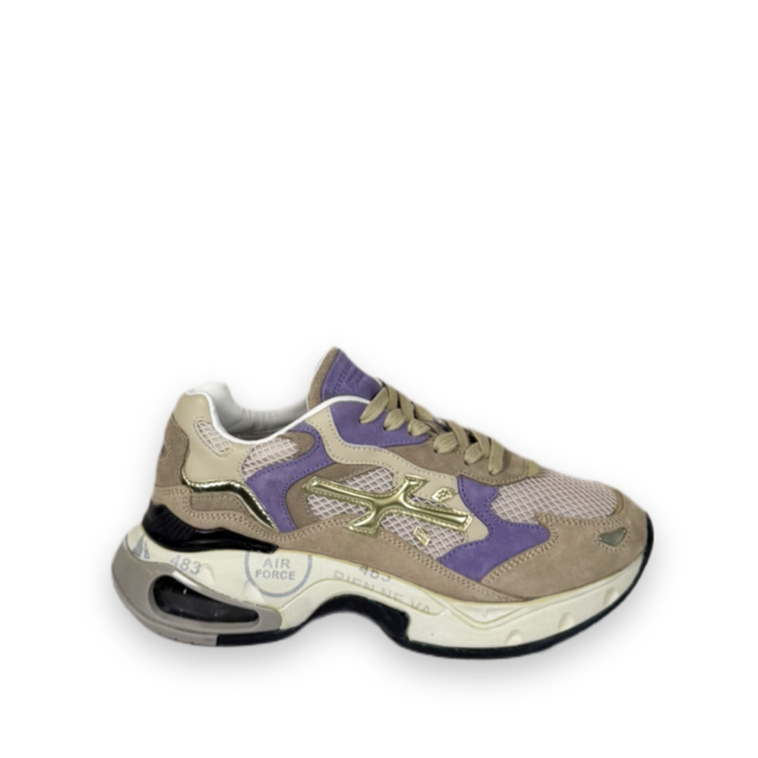 Deze fantastische sneaker is uitgevoerd in beige en paars suède, mesh en goud metallic details. De Sharky is een luxe model met extra demping en vering in de zool. Dat zie je terug in het stukje see-through aan de achterkant. De veters zijn ook in beige uitgevoerd en de loopzool is zwart, waardoor deze sneaker het hele jaar door gedragen kan worden.