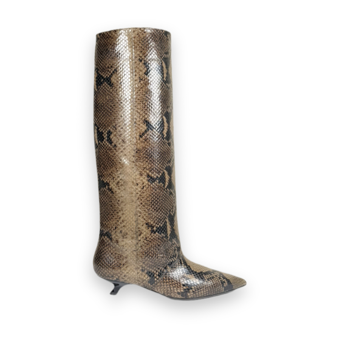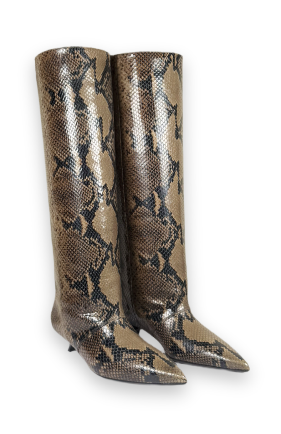 Wat een beauty! Deze lange laars is gemaakt in een pythonprint in bruin/groen/zwart tinten. Het model heeft een klein terugspringend zwart hakje. De schacht is lang en recht en geeft een stoer en vrouwelijk effect. Het model heeft een spitse neus en is leer gevoerd.