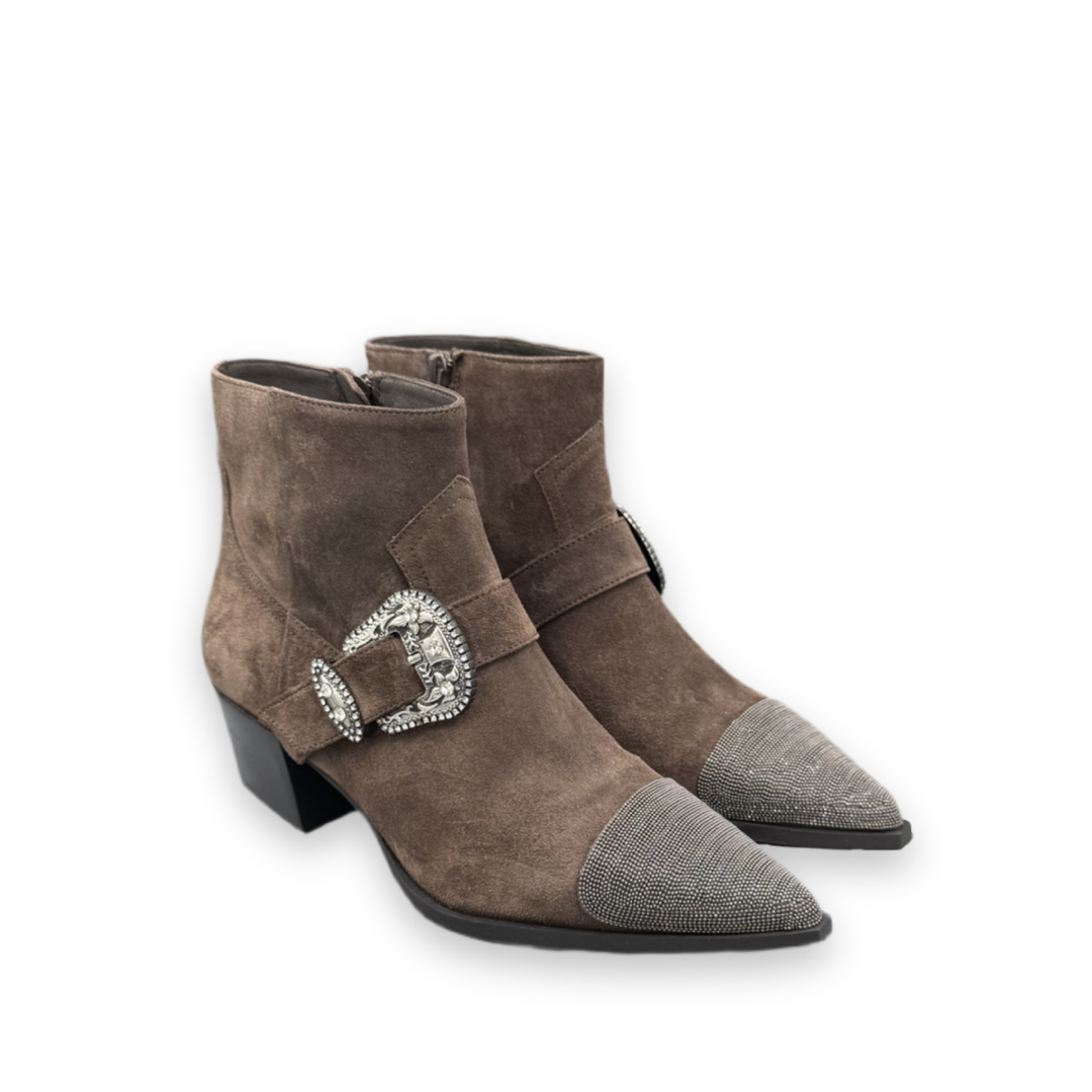 Deze korte laars met spitse neus valt op door de gouden glitters aan de voorkant van de neus. De schoen is afgewerkt met een gouden gesp voor een beetje een western look. De schoen is uitgevoerd in een bruine suède. De hakhoogte is 5,5 cm.