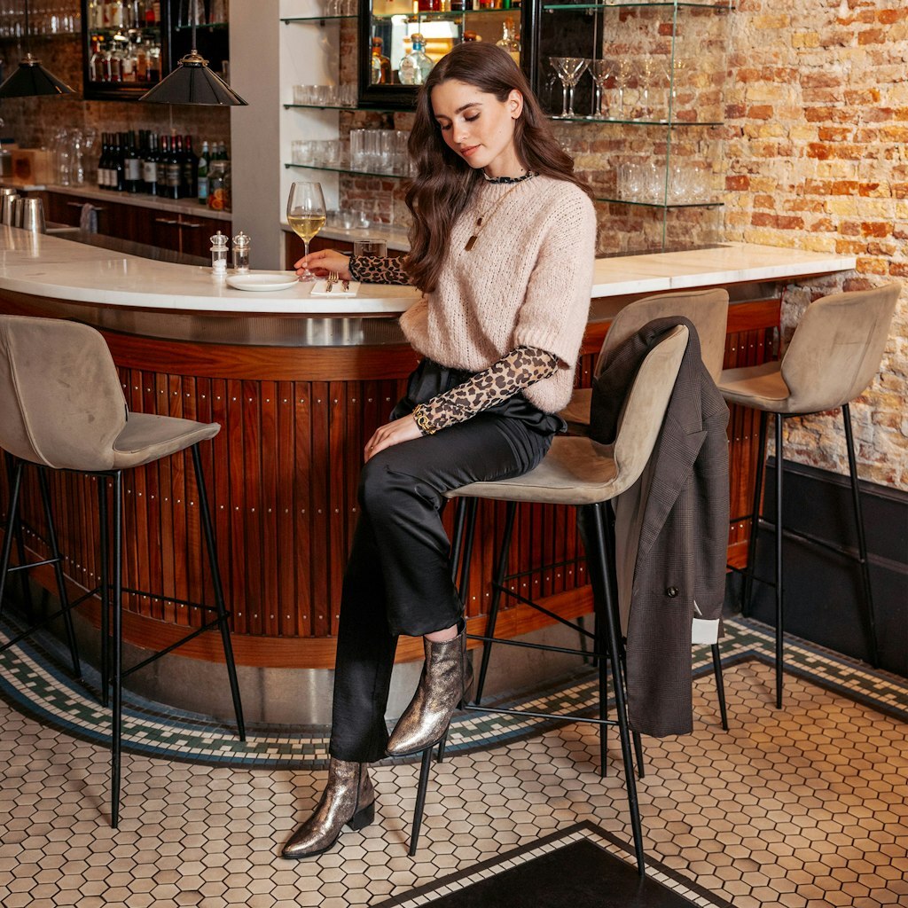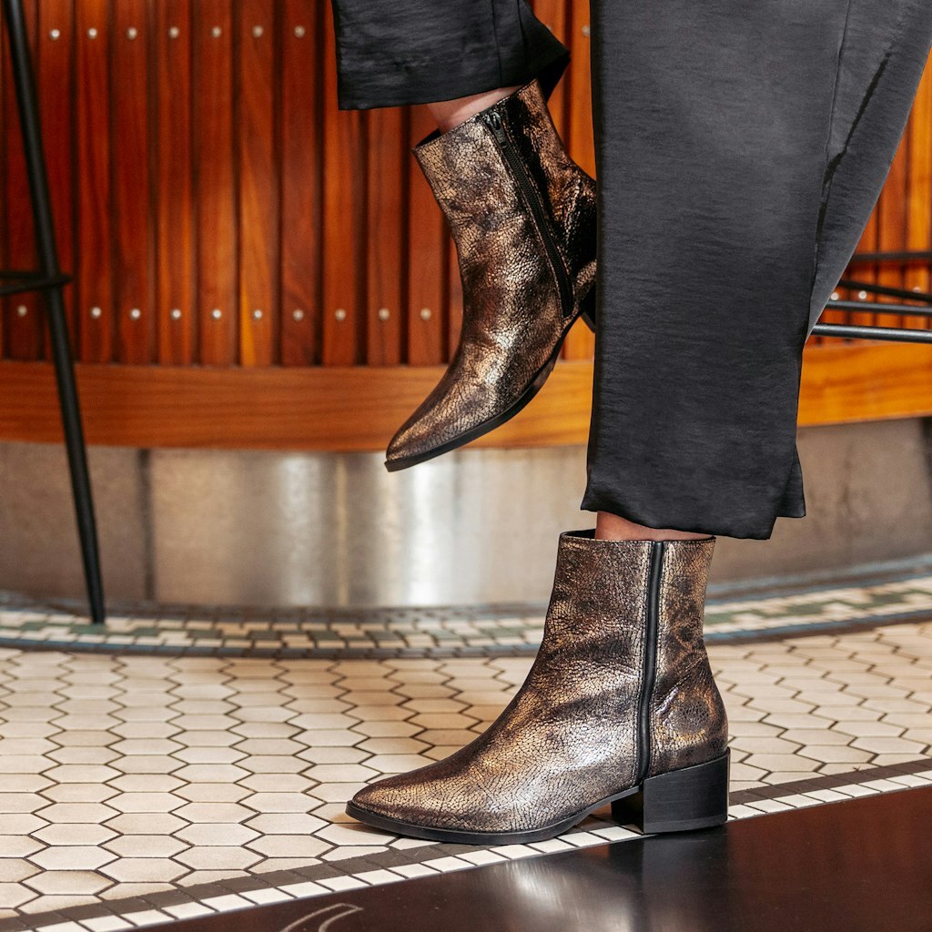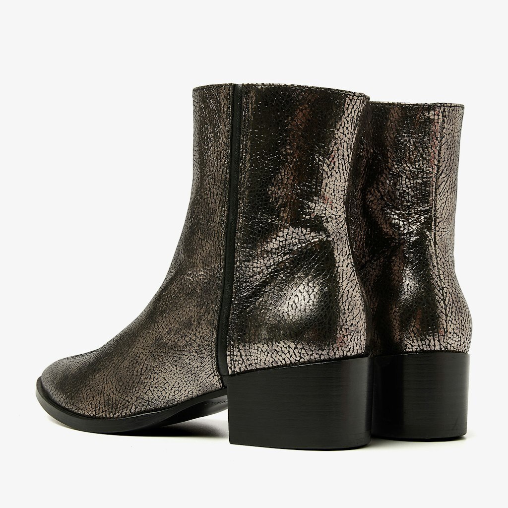 Dit korte laarsje is net nieuw in de collectie! Het model heeft een spitse neus en een klein hakje. Het laarsje heeft een rits aan de binnenkant en het model is met leer gevoerd. Het laarsje is uitgevoerd in zilver metallic.