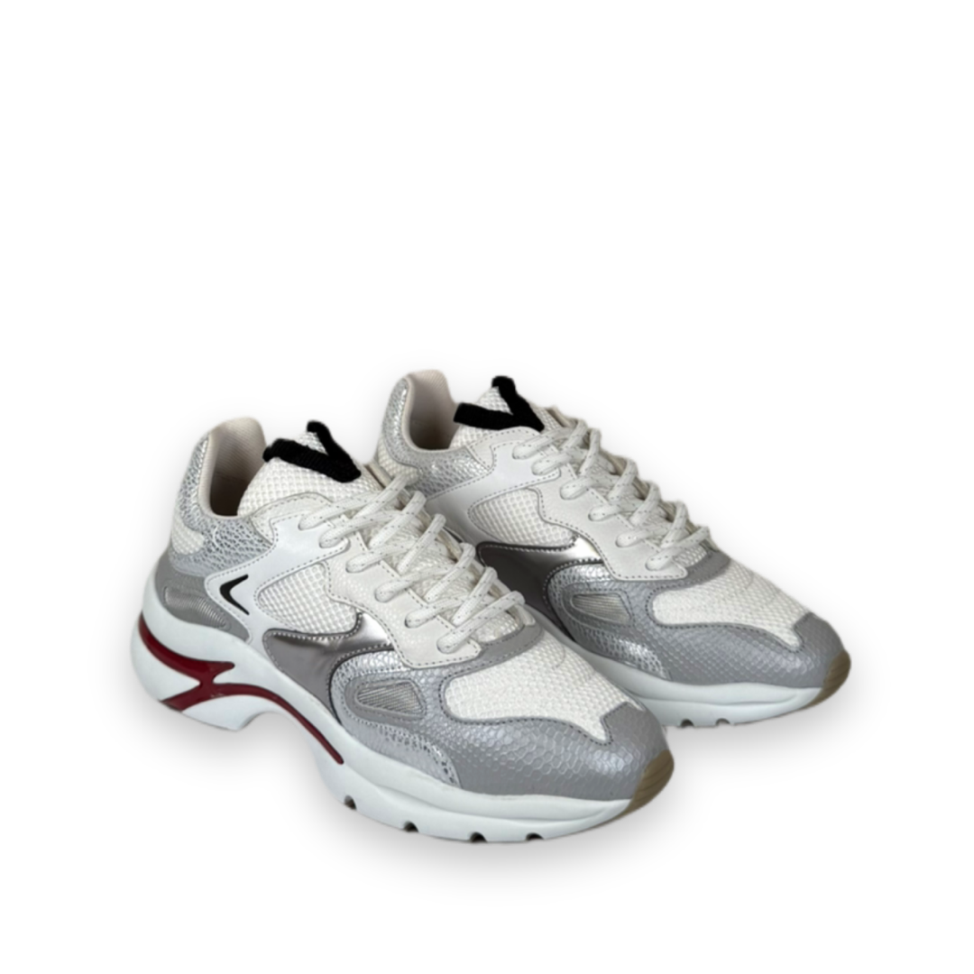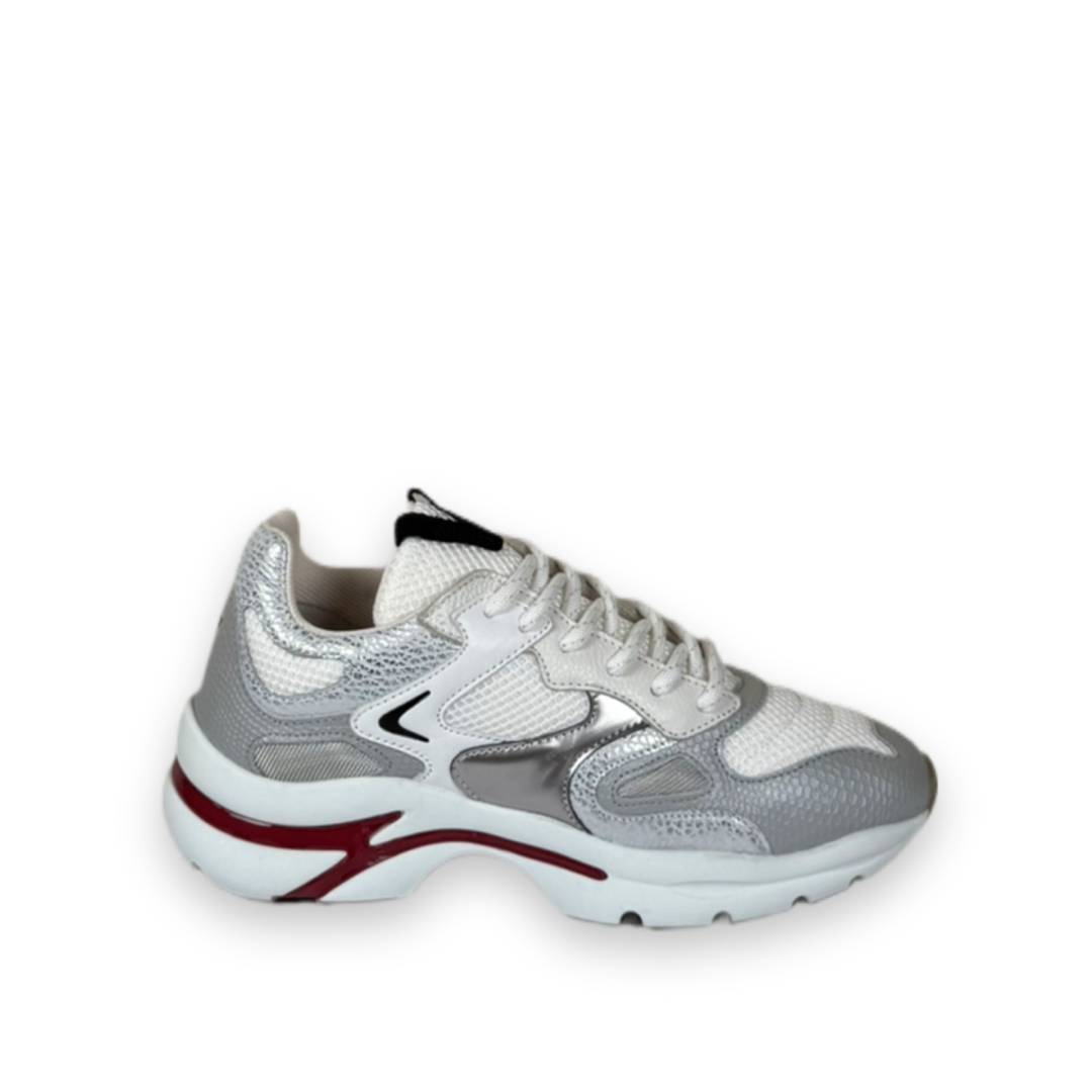 Deze lage sneaker is uitgevoerd op een nieuwe zool. De zool oogt wat minder grof en is lekker sportief. Het model is gemaakt van zilver metallic leer en mesh en heeft een rood accent door de zool heen lopen. De leren binnenzool is uitneembaar.