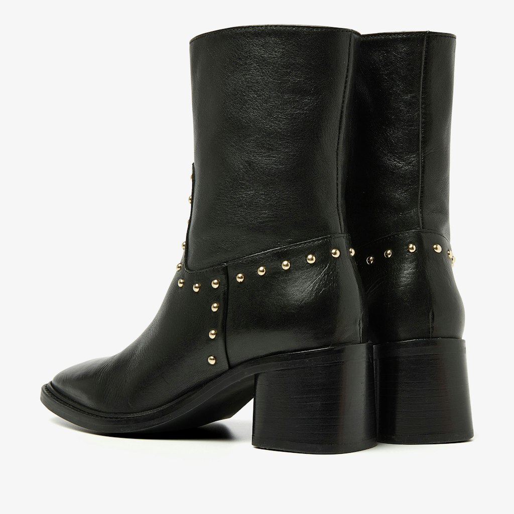 Deze halfhoge laars heeft een carré neus een is versierd met gouden studs. Het model heeft een rits aan de binnenkant en is leer gevoerd. Het laarsje heeft een rechte schacht.