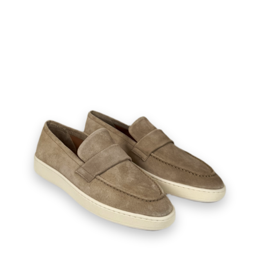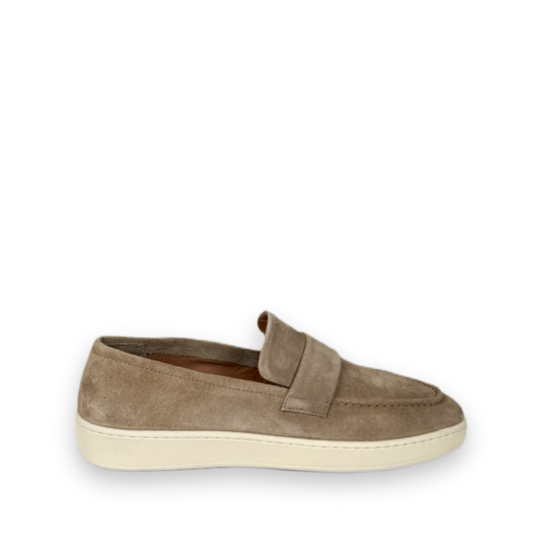 Deze loafer is uitgevoerd in beige suède en heeft een lichte zool. Het model oogt slank maar heeft een bredere pasvorm. De leren binnenzool is uitneembaar.