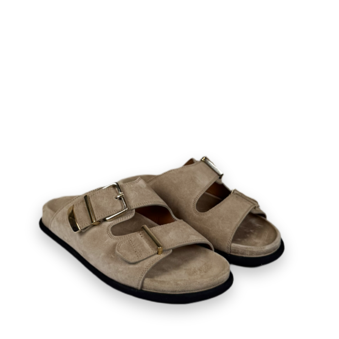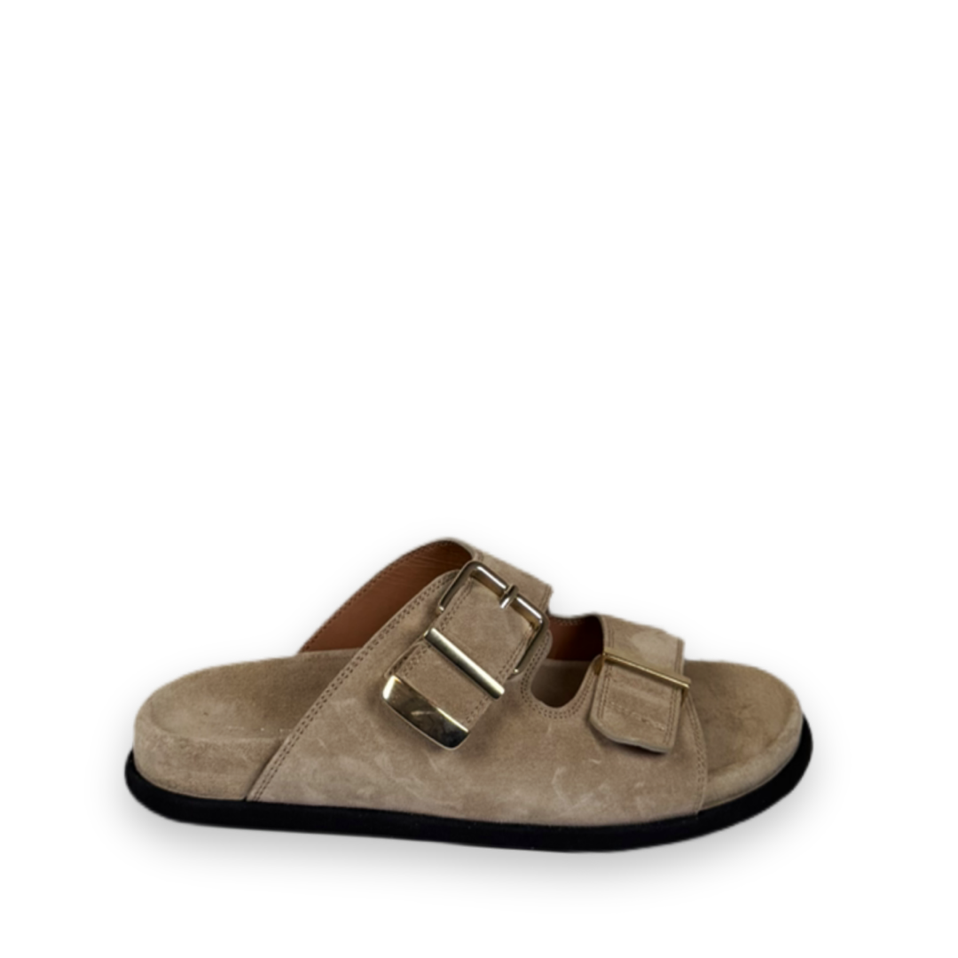 Deze slipper heeft een voorgevormd voetbed en is helemaal uitgevoerd in beige suède. Het model heeft twee banden over de voet lopen en een zwarte rubberen loopzool.