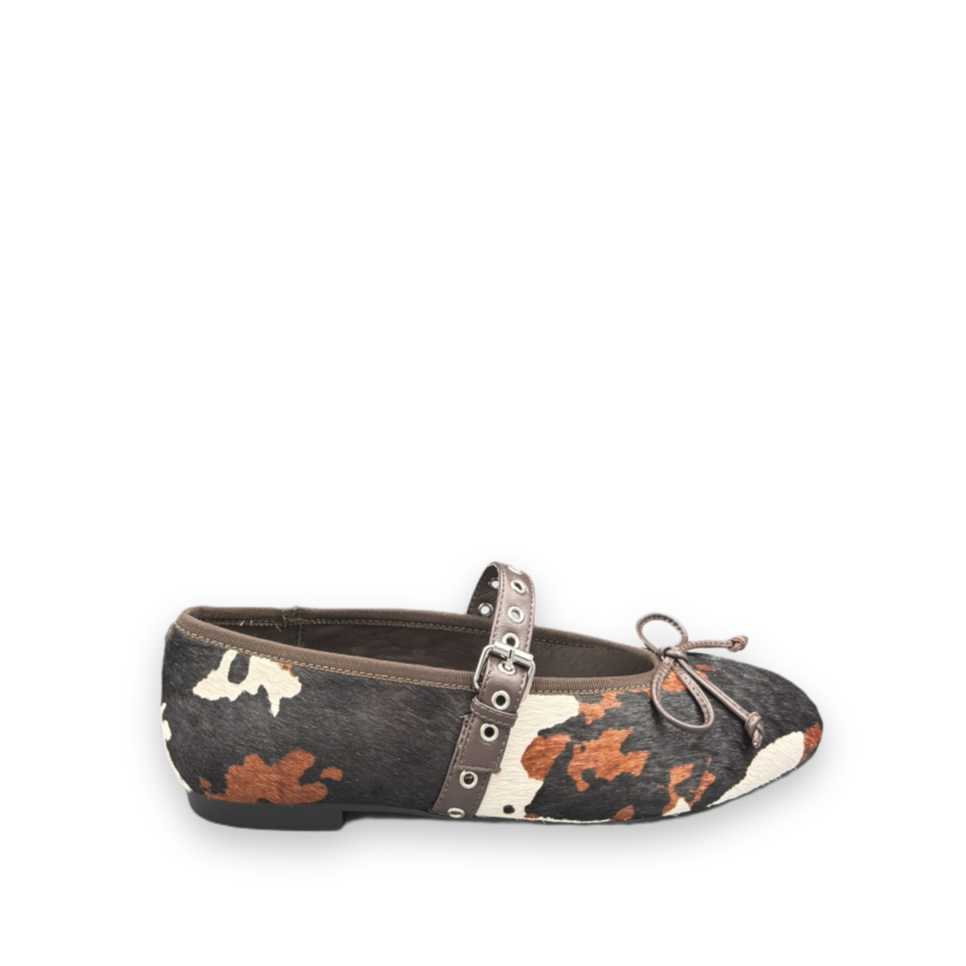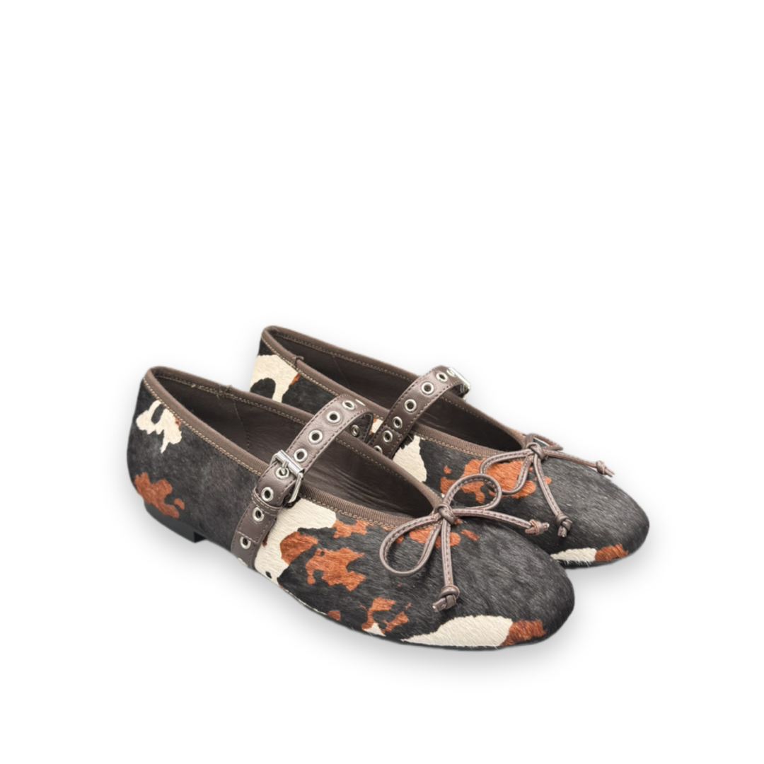 Deze ballerina van Bibi Lou valt op door de bruin met zwart en witte print. De schoen heeft een leren gesp over het midden lopen in een bruine kleur. De schoen is uitgevoerd in ponyhaar, met een koe-achtige print. Op de voorkant van de ballerina zit een subtiele strik, gemaakt van bruin leer.