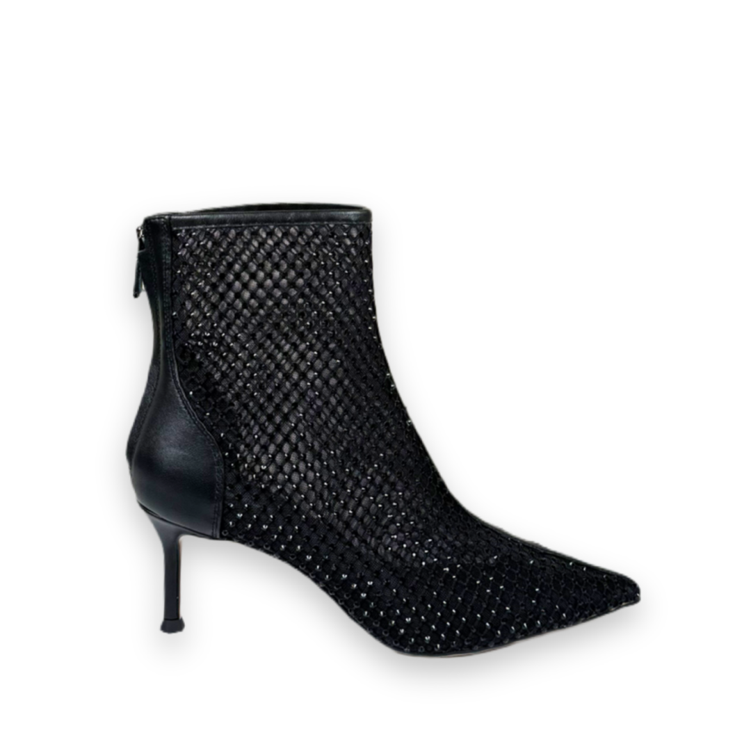 Deze sexy laars is uitgevoerd in zwart leer en zwart mesh versierd met zwarte steentjes. Het model heeft een rits aan de achterkant en het smalle hakje is zwart leer bekleed.