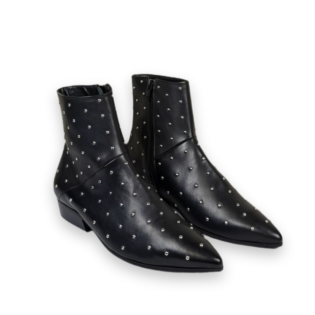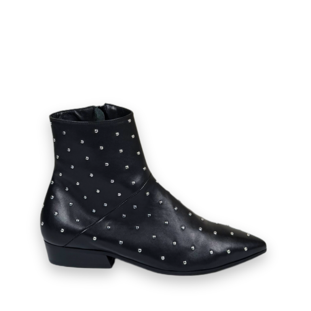 Dit korte laarsje is uitgevoerd in zwart leer en is versierd met zilveren fijne studs. Het laarsje heeft een spitse neus en een rits aan de binnenkant. Het hakje is ongeveer 2 centimeter hoog.