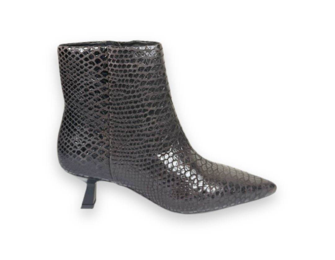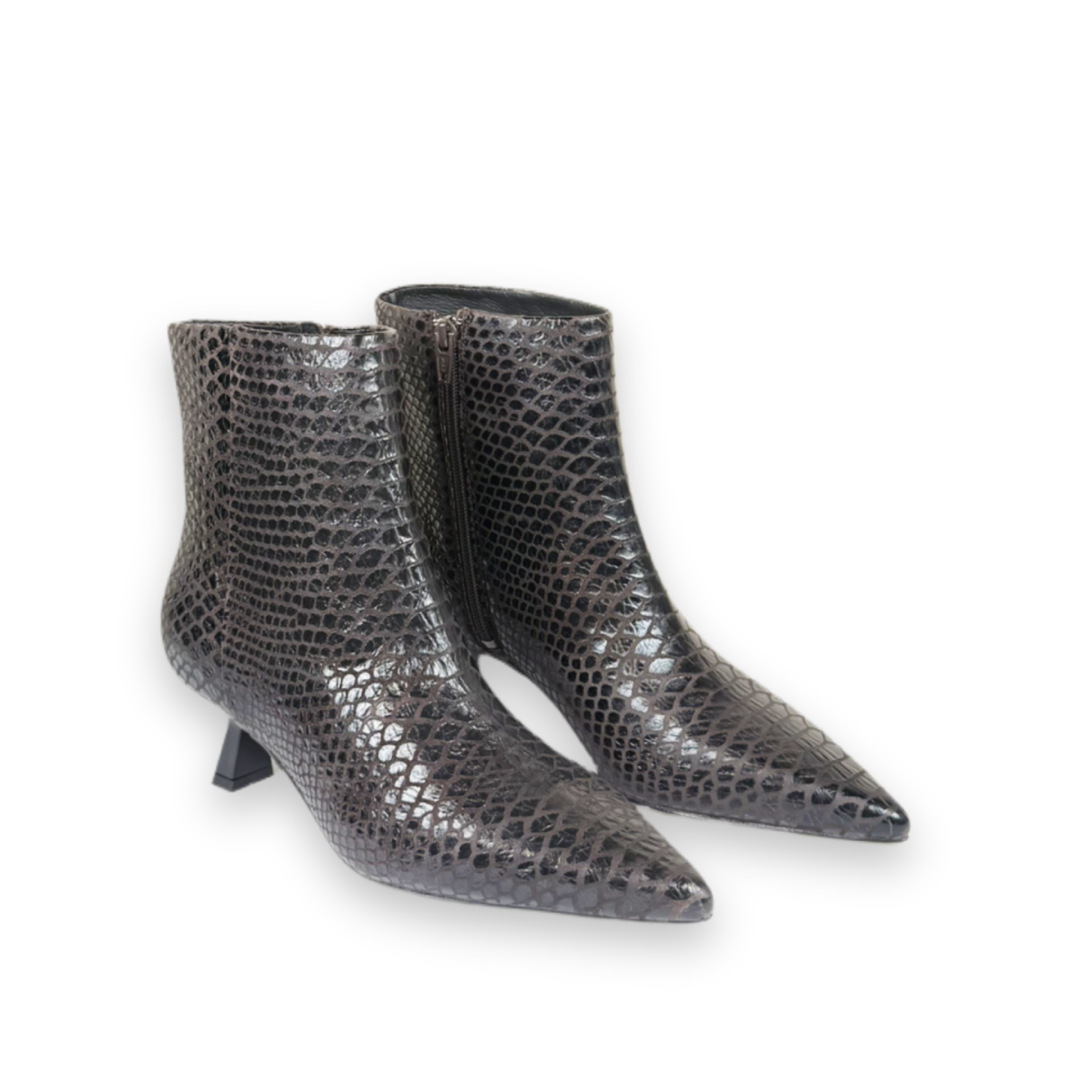 Dit korte laarsje is uitgevoerd in bruin leer met een subtiele slangenprint. Het model heeft een spitse neus en een klein kunstof hakje. Het model heeft een rits aan de binnenkant en is leer gevoerd.