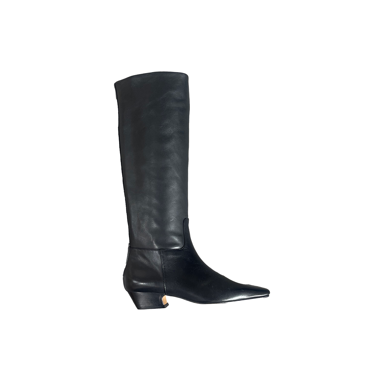 Deze prachtige en luxe lange laars is uitgevoerd in hoogwaardig zwart leer. Het model heeft een rechte schacht en een carré neus. De laars heeft een klein zwart hakje.