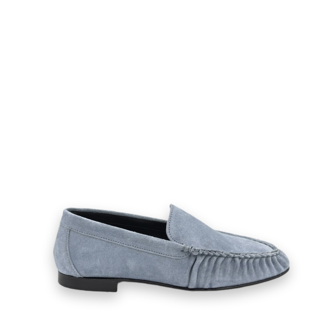 Deze loafer, gemaakt van een zachte suède, is uitgevoerd in een blauwe kleur. Opvallend aan de loafer zijn de plooien aan de voorkant van de schoen. De neus is rond.