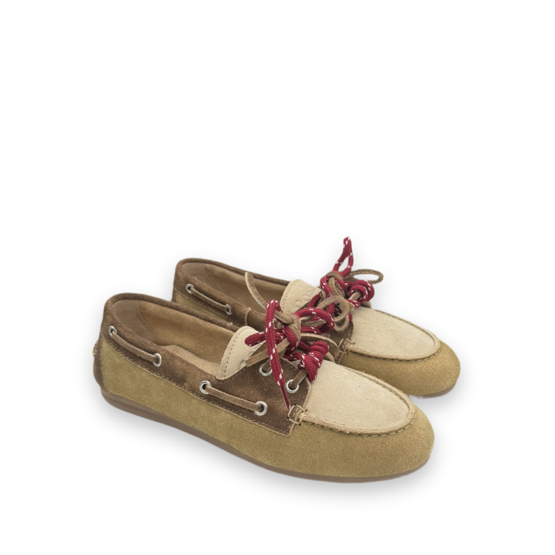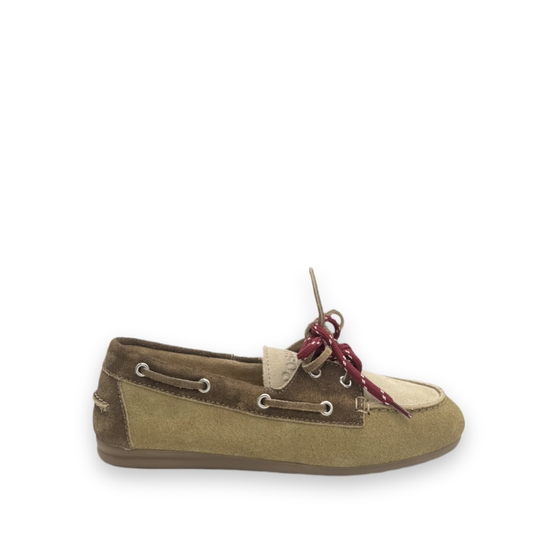 Deze boat loafer is gemaakt van een zachte suède. Opvallend aan de schoen zijn de verschillende kleuren. De zijkant van de loafer heeft een groen beige kleur, de rand en hiel zijn uitgevoerd in een bruine kleur en de ronde neus van de schoen heeft een lichtbeige kleur. De schoen heeft zowel bruine leren veters, als rode veters ter detail.