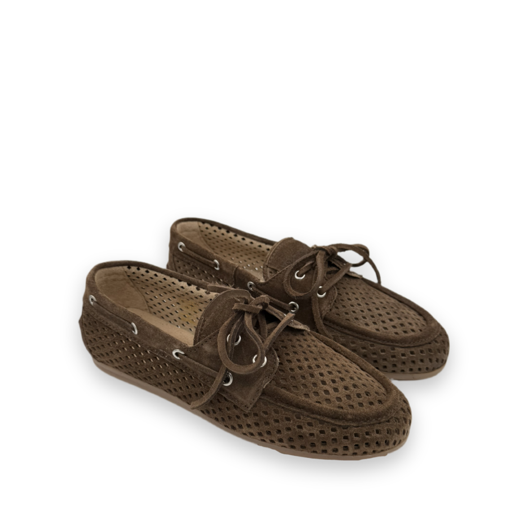 Deze loafer is ideaal voor de warme dagen. Hij is gemaakt van een bruine, suède stof en heeft door de gehele schoen geperforeerde gaatjes. Aan de randen zitten zilveren ringetjes ter detail.