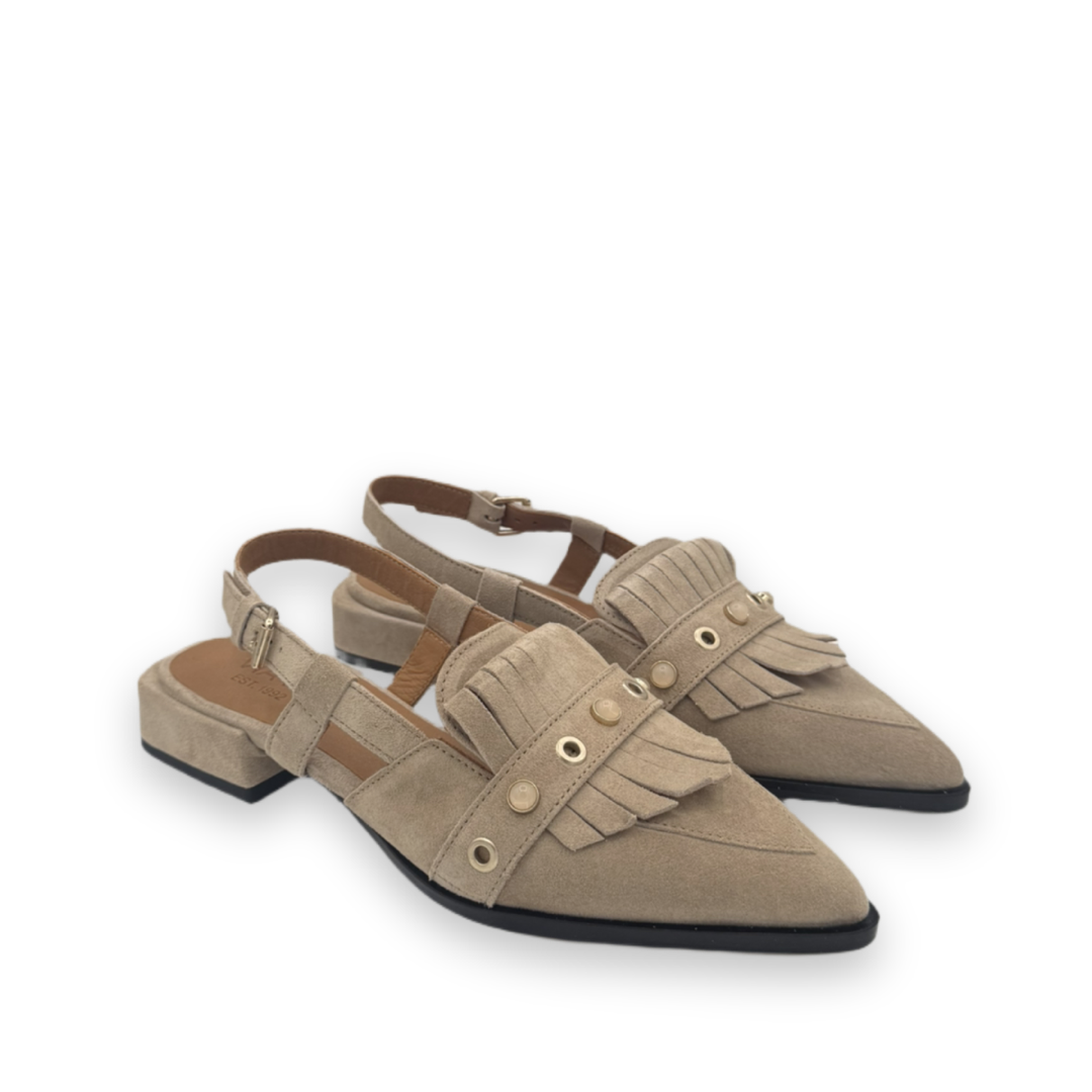 Deze loafer is gemaakt van een zachte suède in een beige kleur. De neus van de schoen is spits en heeft fringes aan de bovenkant. Over deze fringes loopt een gespje met ringen en beige studs. De schoen heeft een verstelbaar enkelbandje rondom de enkel.