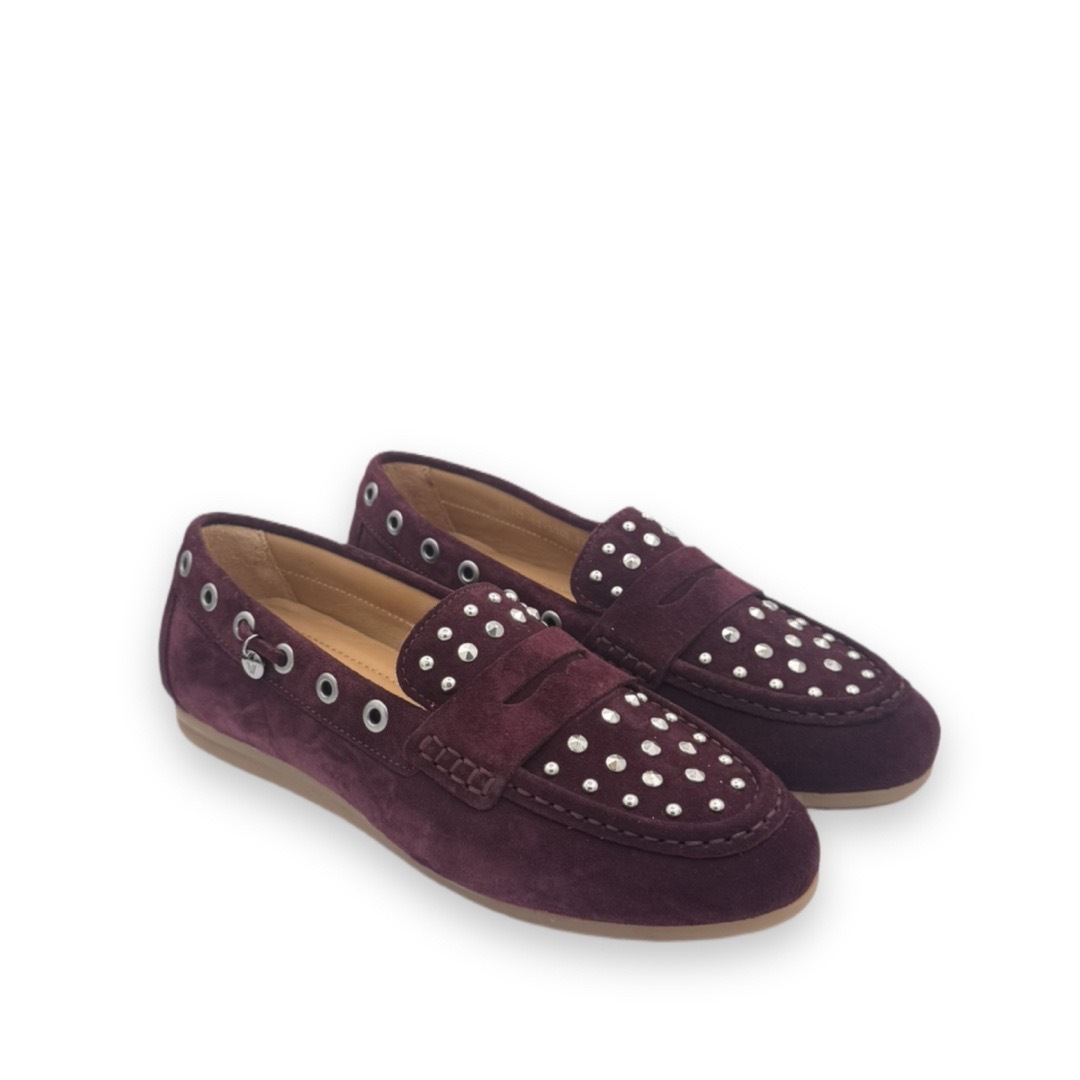 Deze loafer in een bordeaux rode kleur is gemaakt van een zachte suède. De voorkant van de loafer heeft zilveren studs en de zijkant zilveren ringetjes, met aan de buitenkant een kleine hanger met hier de ‘V’ op.