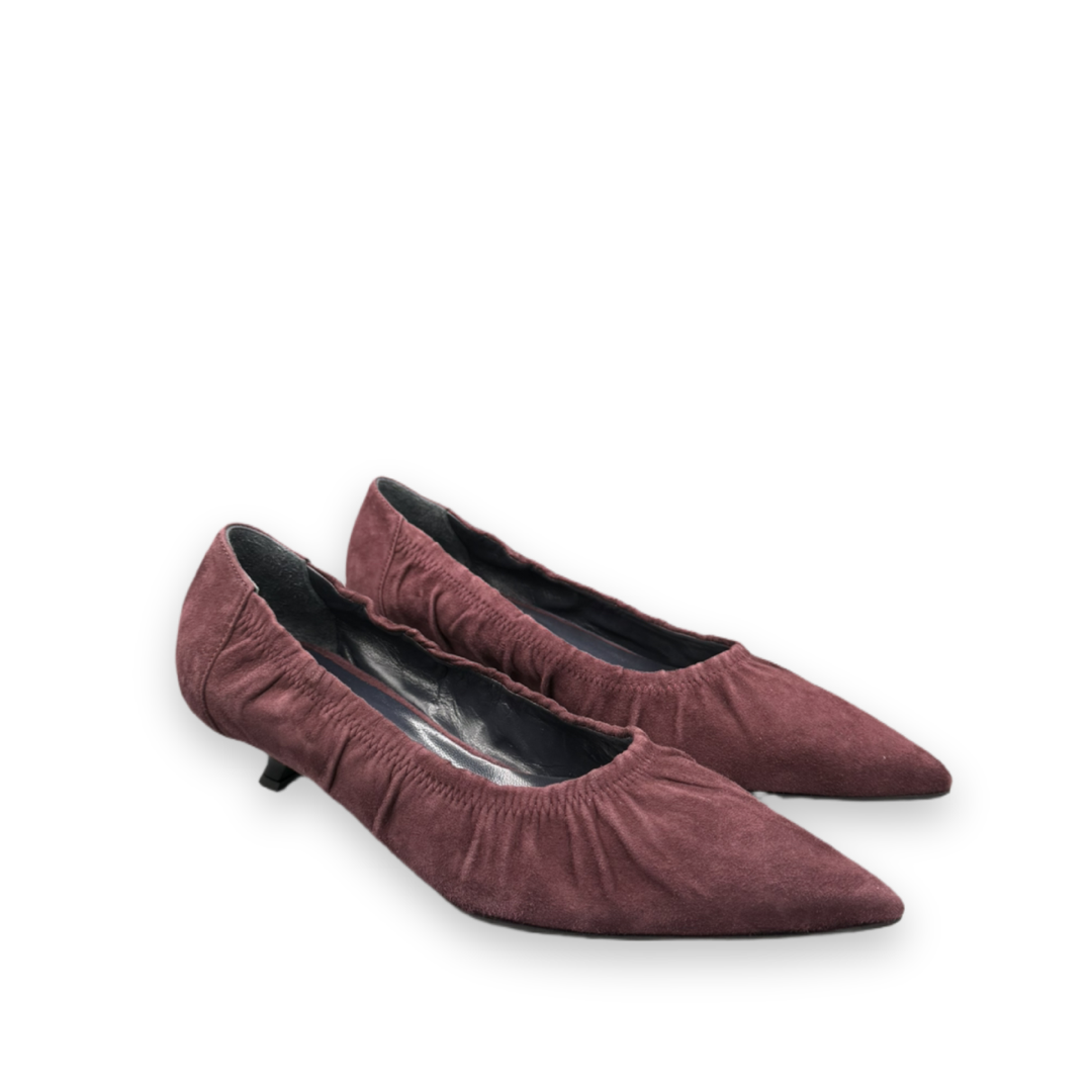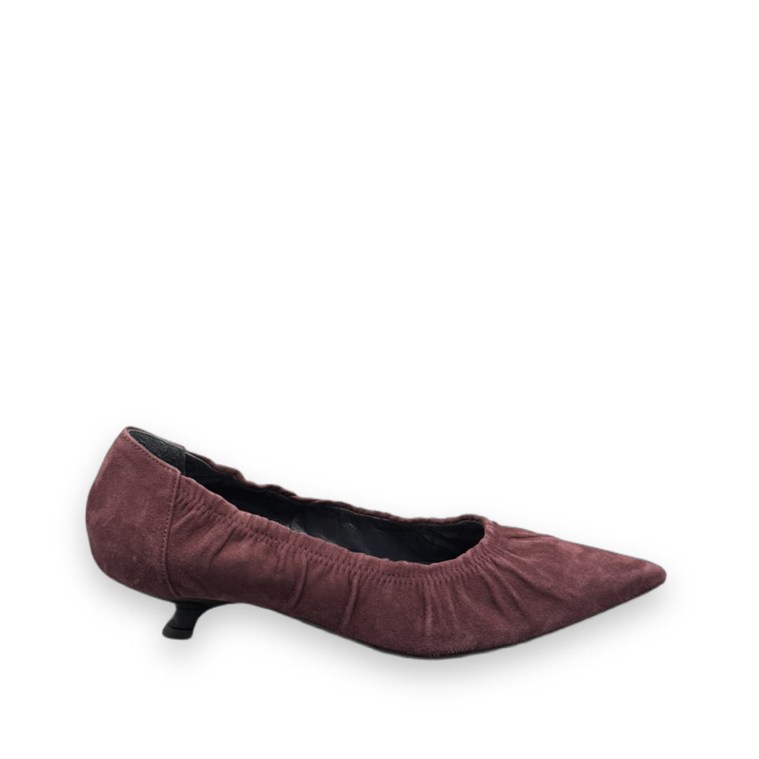 Deze pump van het merk Rotue is gemaakt van een zachte suède en is uitgevoerd in het bordeaux. De stof is geplooid aan de opening van de pump. De hak heeft een hoogte van 3,5 cm.