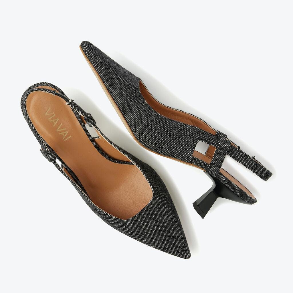 Deze gave slingback is uitgevoerd in zwarte jeans en heeft een spitse neus en een open hiel. Het model heeft een queenie-hakje en een verstelbaar bandje.