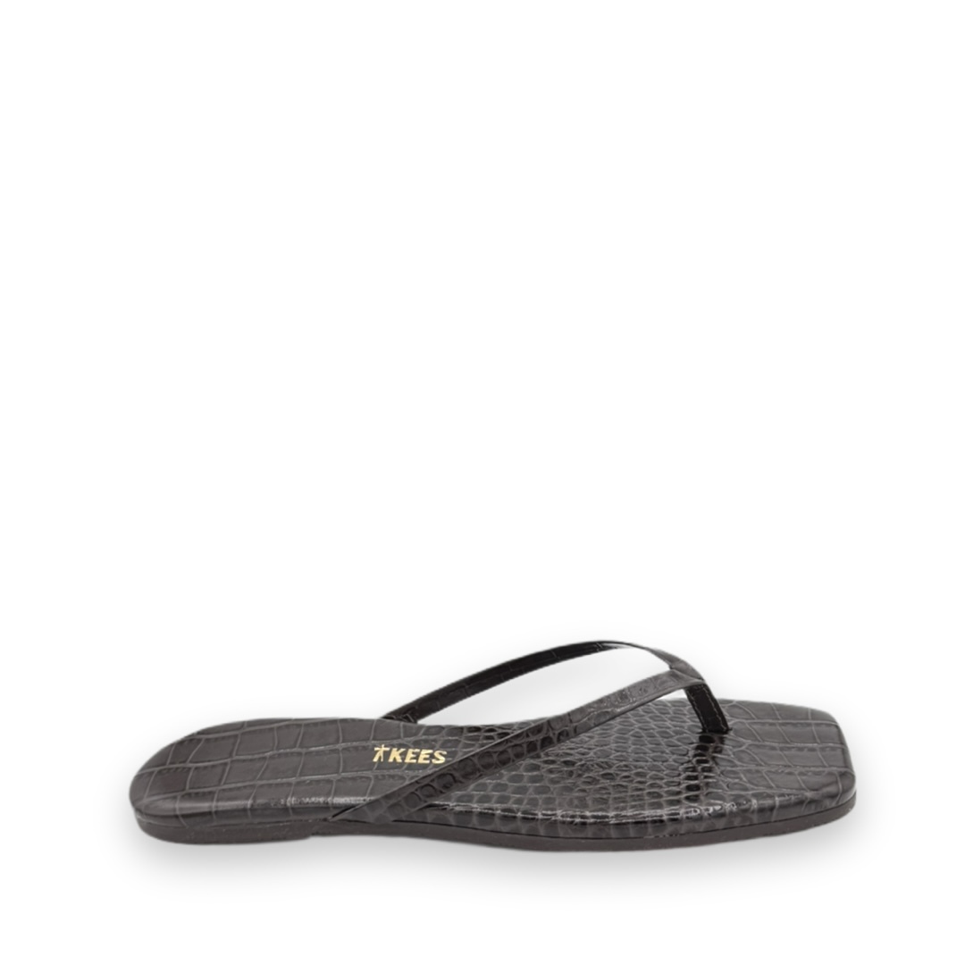 Deze teenslipper, gemaakt van leer, is uitgevoerd in een donkerbruine kleur met een opvallende croco print. Hij heeft een rechte neus en een moderne stijl. De ideale slipper voor in de zomer. LET OP: De slipper valt klein, pak een maat groter dan je eigen maat!
