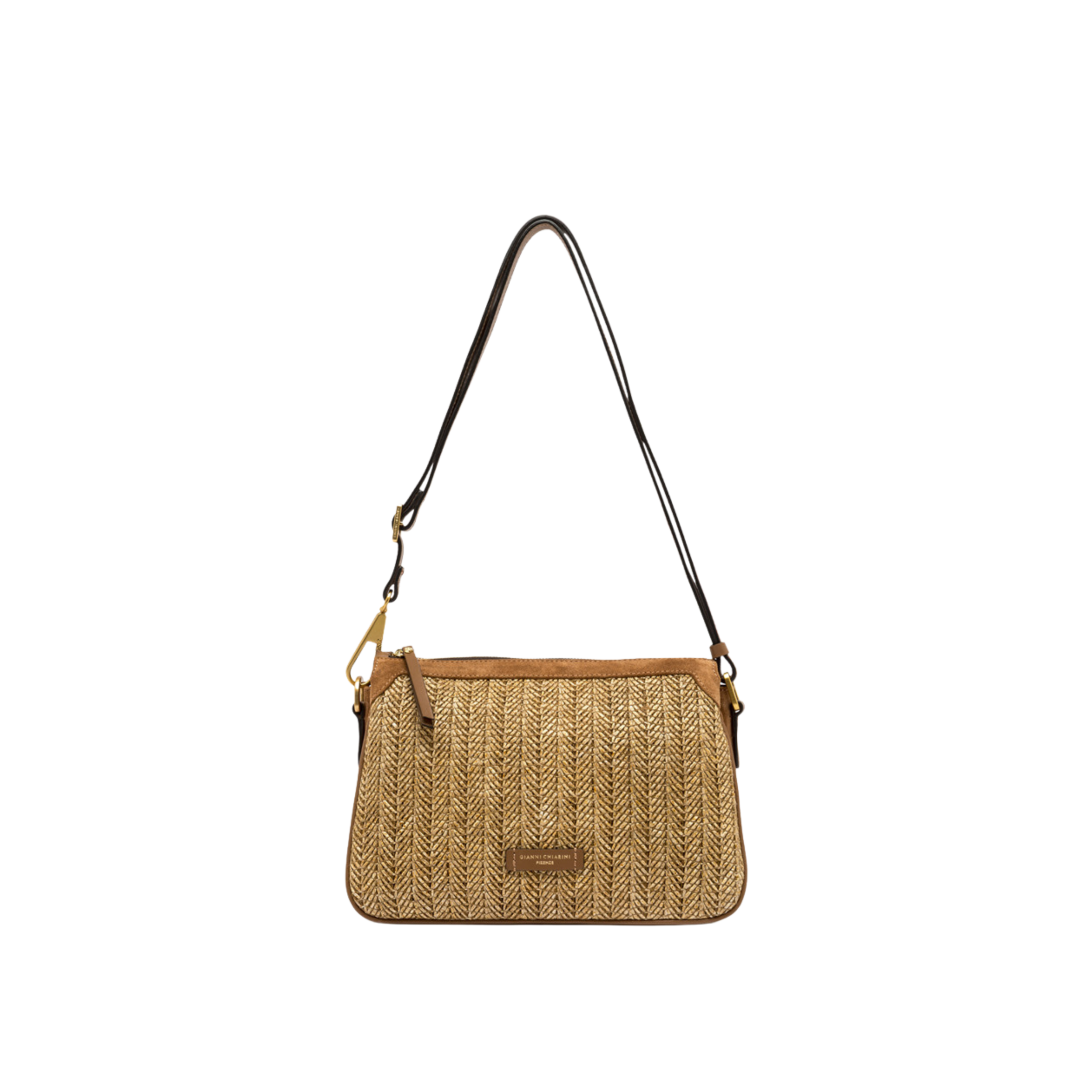 Deze crossbody tas is gemaakt van verschillende materialen. Zo heeft de tas een gevlochten look van gewoven stro. De bovenrand van de tas is gemaakt van een zachte suède in cognac kleur. Verder is het verstelbare hengsel ook gemaakt van leer. De tas sluit met ritssluiting.