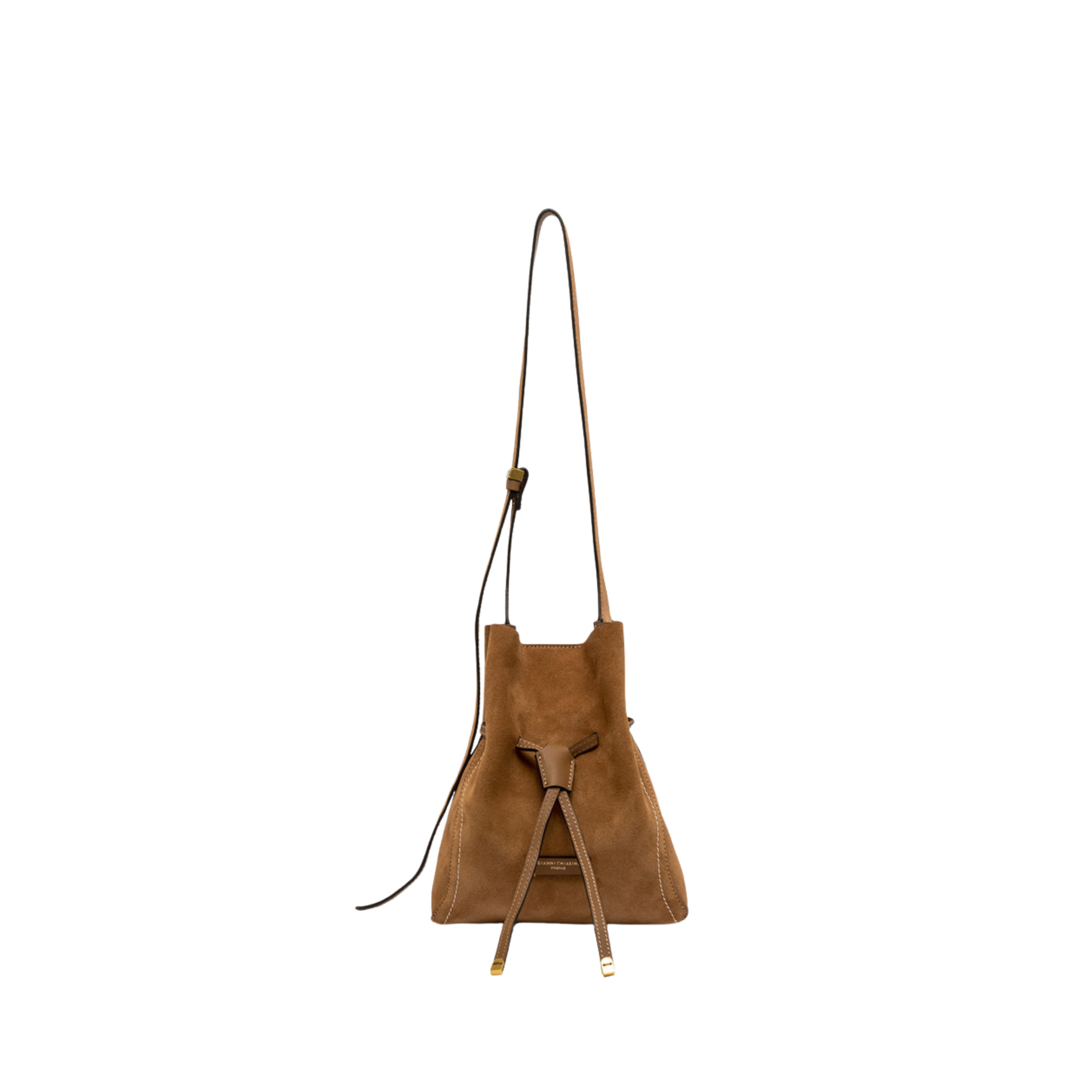 Schoudertas in een zachte suède uitvoering. De tas heeft een cognac kleur en leren touwtjes aan de voorkant, wat de bucketvorm geeft. Hij heeft een vak en sluit met magnetische drukknoop.