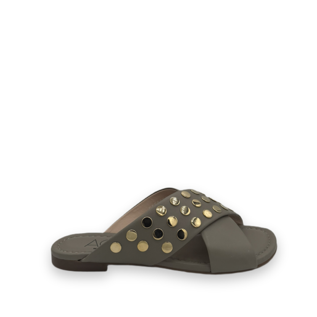 Deze slipper is ideaal voor de zomerdagen. Hij heeft een groene kleur met een gekruiste leren banden op de bovenkant van de voet. Deze zijn afgemaakt met gouden studs. De slipper is gemaakt van leer.